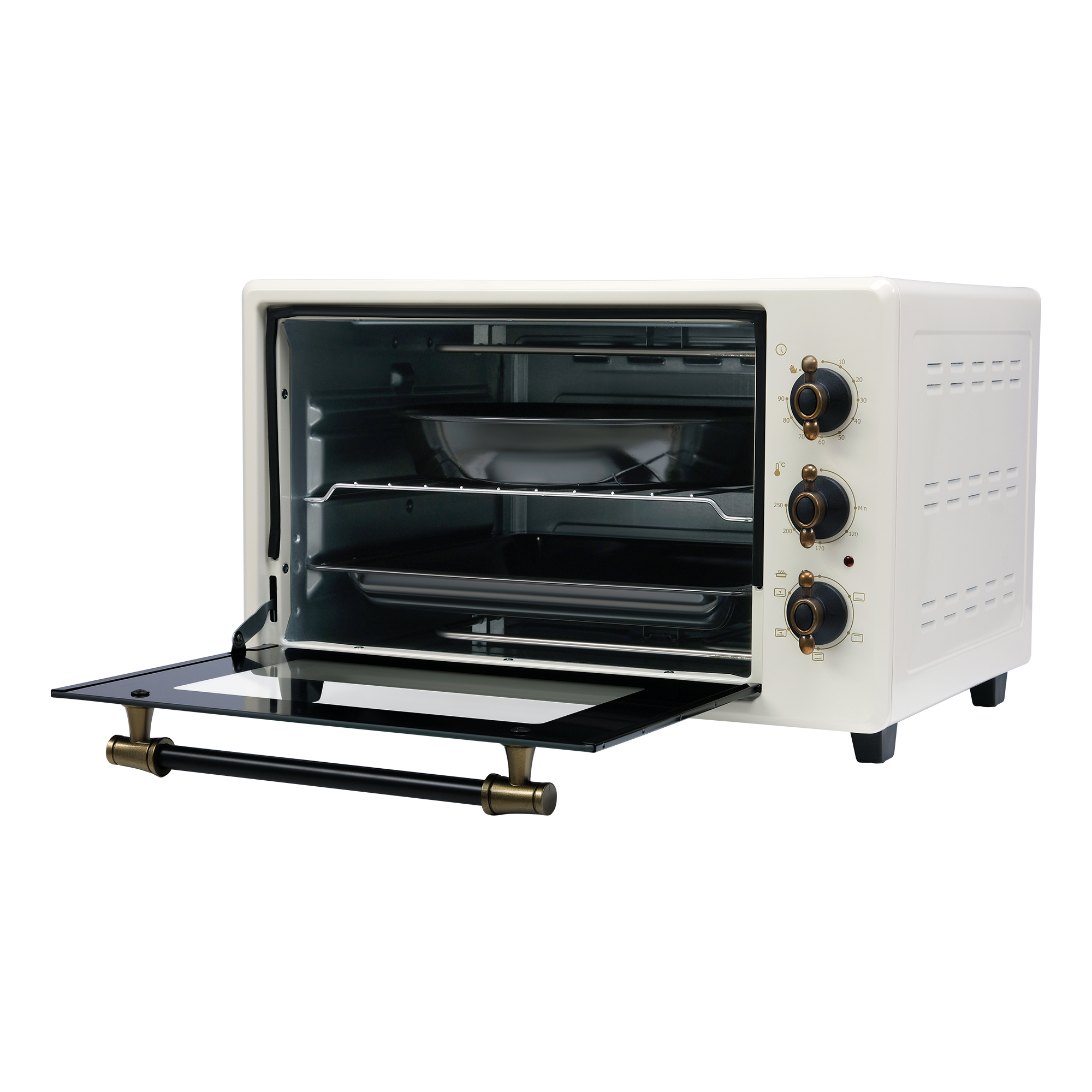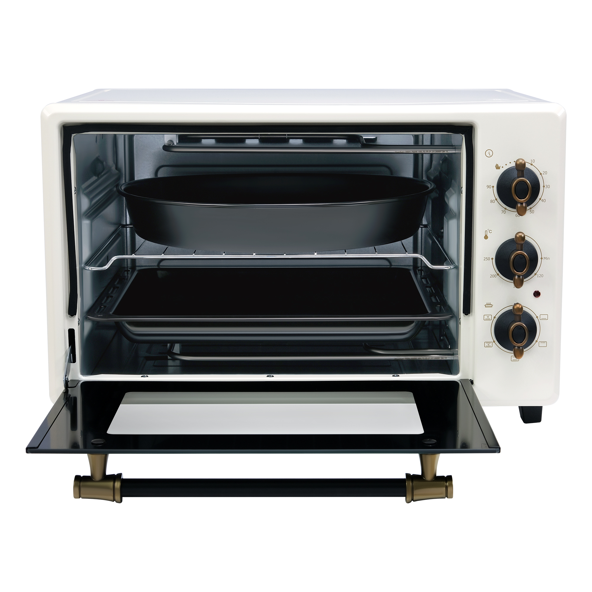 Все элементы у мини-печи выполнены с вниманием к деталям. Механическая панель управления легко настраивается и позволяет сфокусировать своё внимание на готовке, а не на настройке мини-печи. Уход за мини-печью занимает минимум усилий: съёмные противни и стеклянная дверца легко моются. В комплекте есть всё необходимое для начала приготовления пищи без покупки дополнительной посуды.