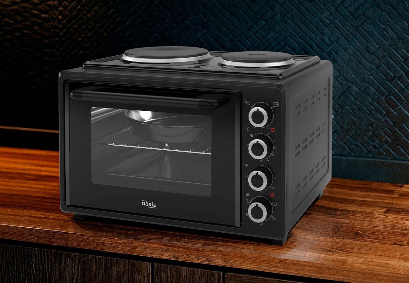 Электрическая мини-печь making Oasis everywhere со встроенными конфорками — это универсальное решение, которое способно заменить сразу духовой шкаф и варочную панель. Устройство актуально в условиях небольшого помещения, например дома без кухни, где нет возможности установить два кухонных прибора, но при этом не хочется ограничивать себя в приготовлении блюд. Функция конвекции обеспечивает равномерную циркуляцию горячего воздуха, благодаря чему блюда пропекаются идеально — без подгоревших краёв и сырых середин.