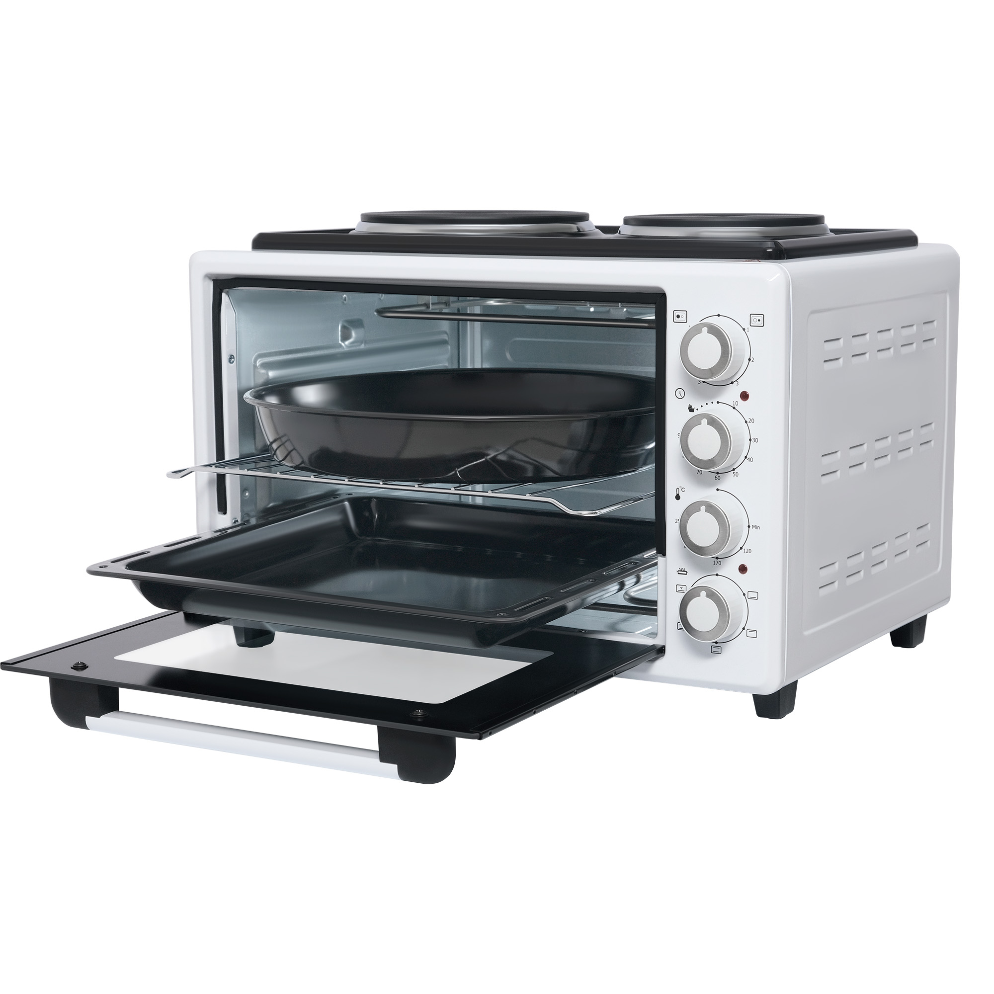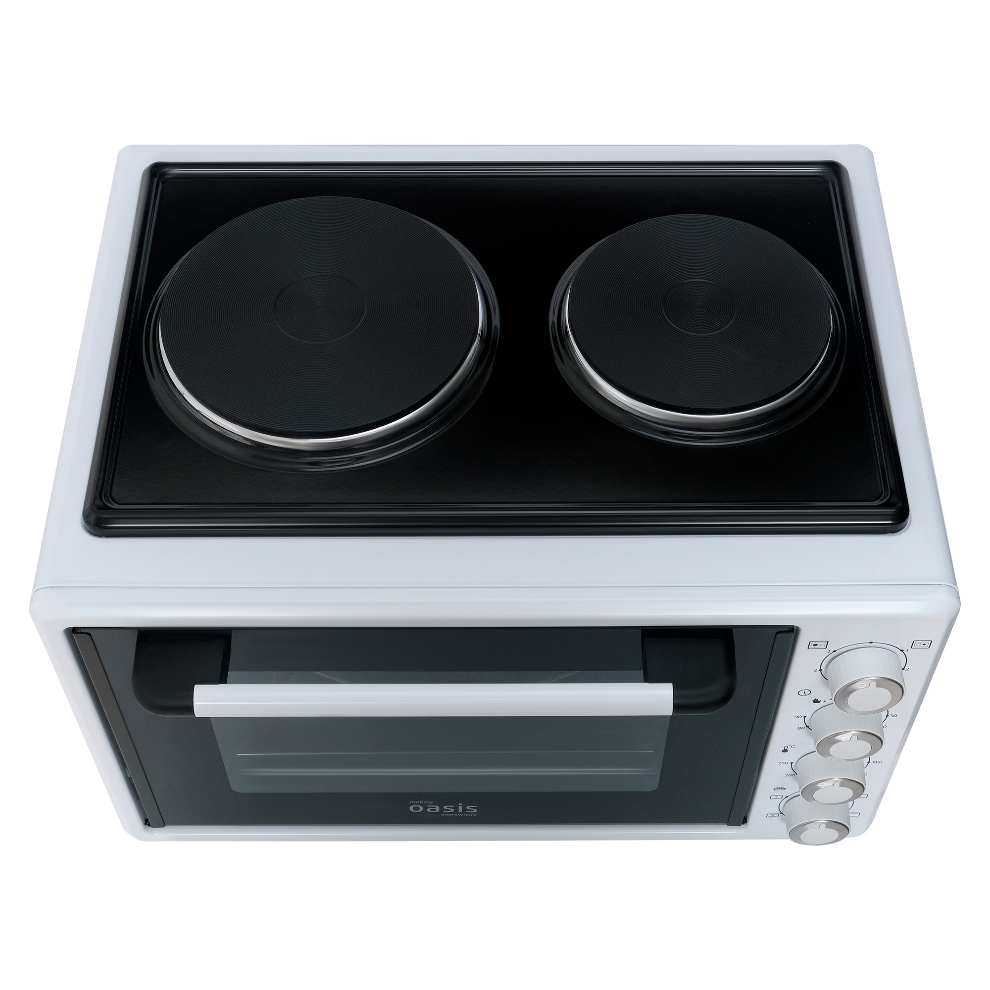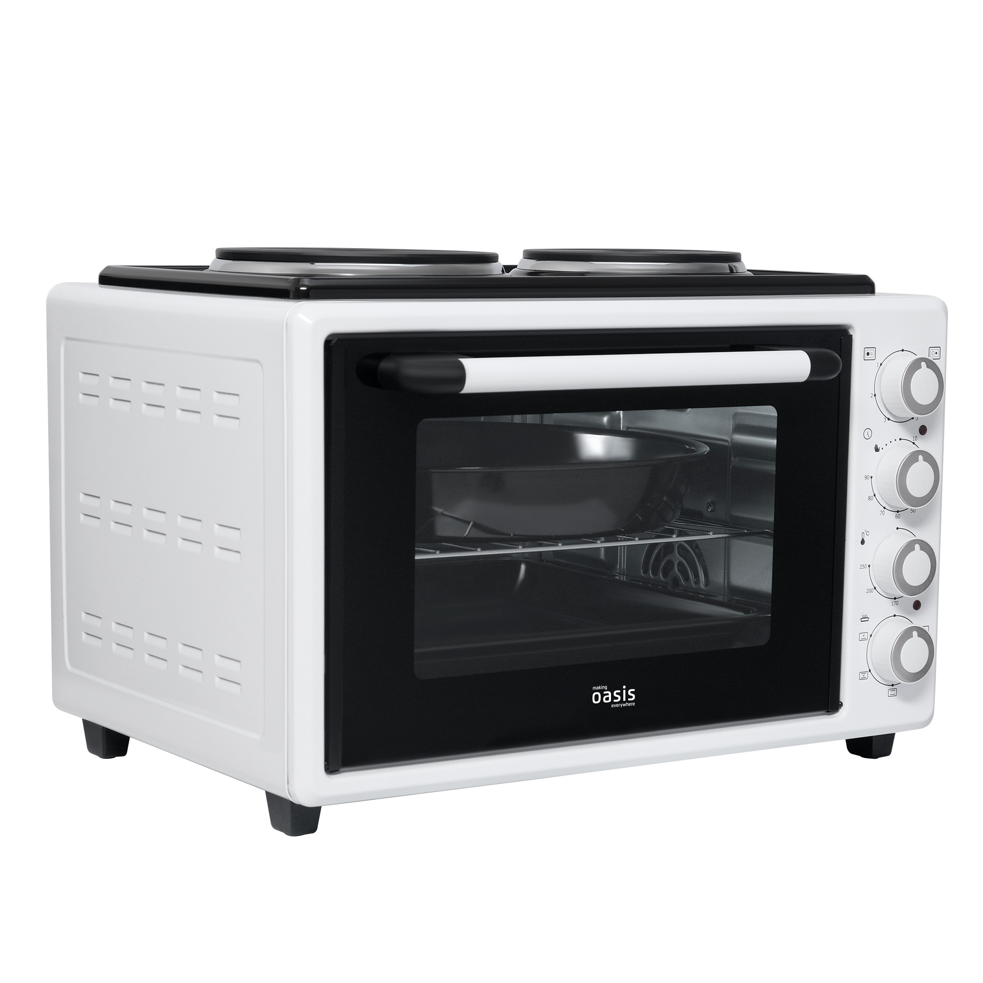 Электрическая мини-печь making Oasis everywhere со встроенными конфорками — это универсальное решение, которое способно заменить сразу духовой шкаф и варочную панель. Устройство актуально в условиях небольшого помещения, например дома без кухни, где нет возможности установить два кухонных прибора, но при этом не хочется ограничивать себя в приготовлении блюд. Функция конвекции обеспечивает равномерную циркуляцию горячего воздуха, благодаря чему блюда пропекаются идеально — без подгоревших краёв и сырых середин.