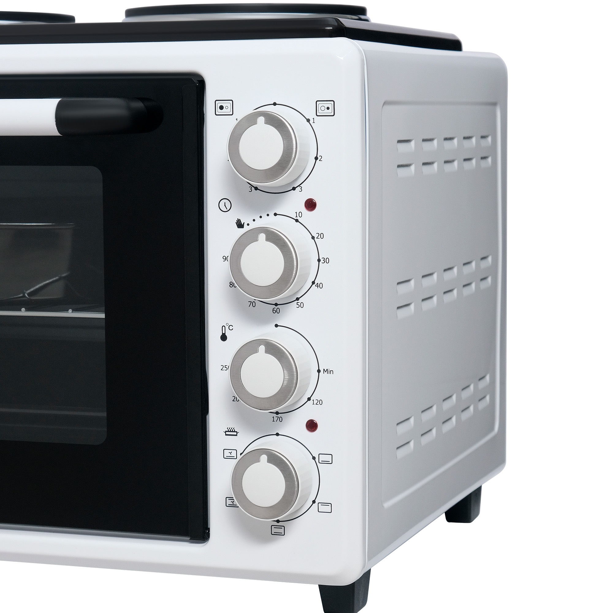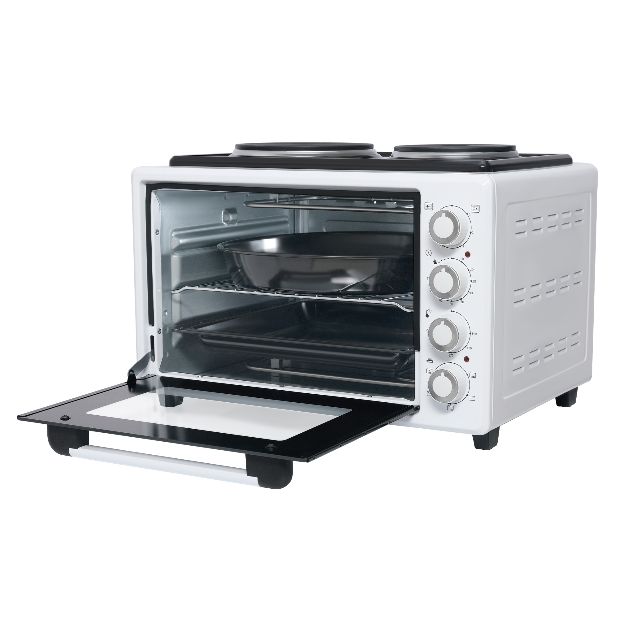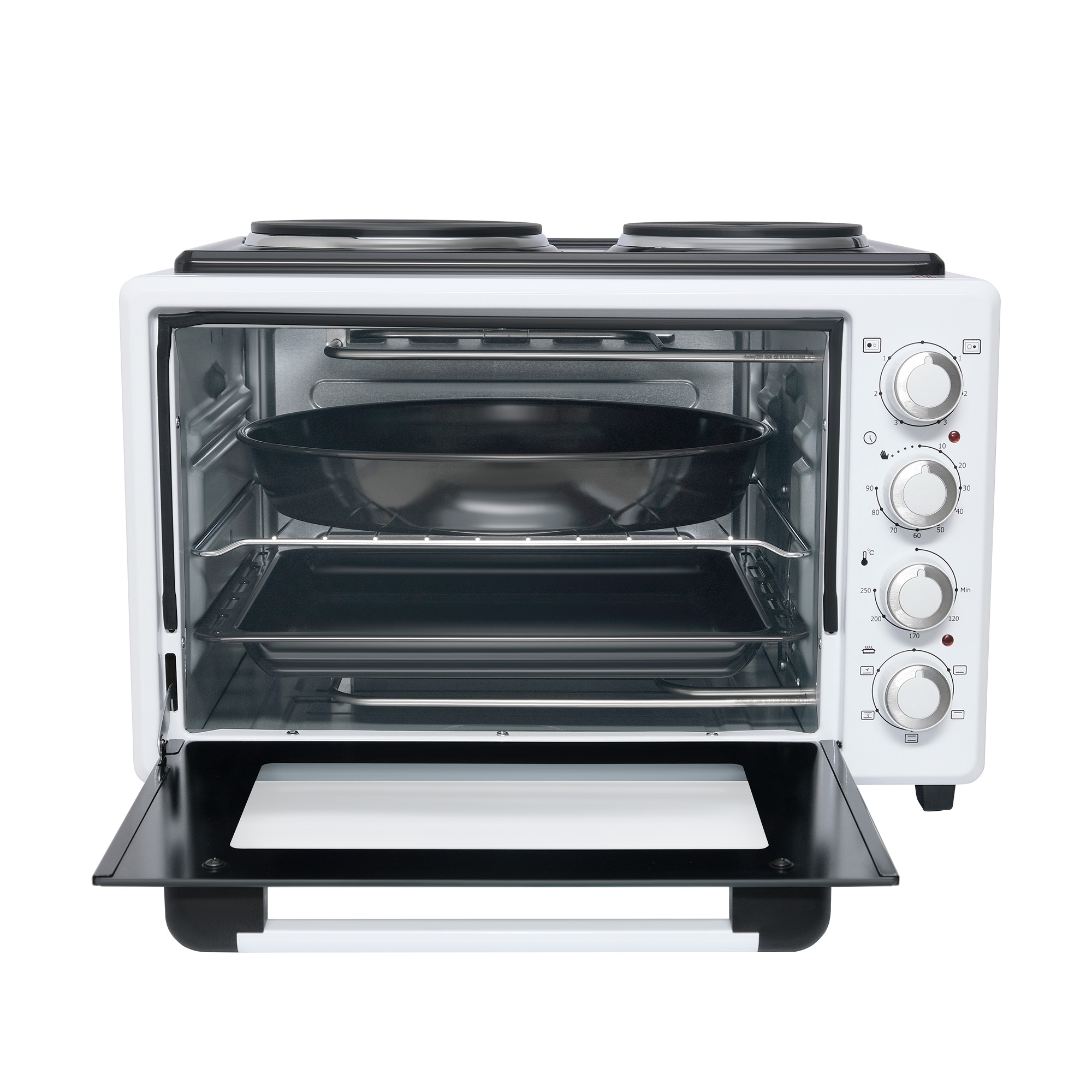 Электрическая мини-печь making Oasis everywhere со встроенными конфорками — это универсальное решение, которое способно заменить сразу духовой шкаф и варочную панель. Устройство актуально в условиях небольшого помещения, например дома без кухни, где нет возможности установить два кухонных прибора, но при этом не хочется ограничивать себя в приготовлении блюд. Функция конвекции обеспечивает равномерную циркуляцию горячего воздуха, благодаря чему блюда пропекаются идеально — без подгоревших краёв и сырых середин.