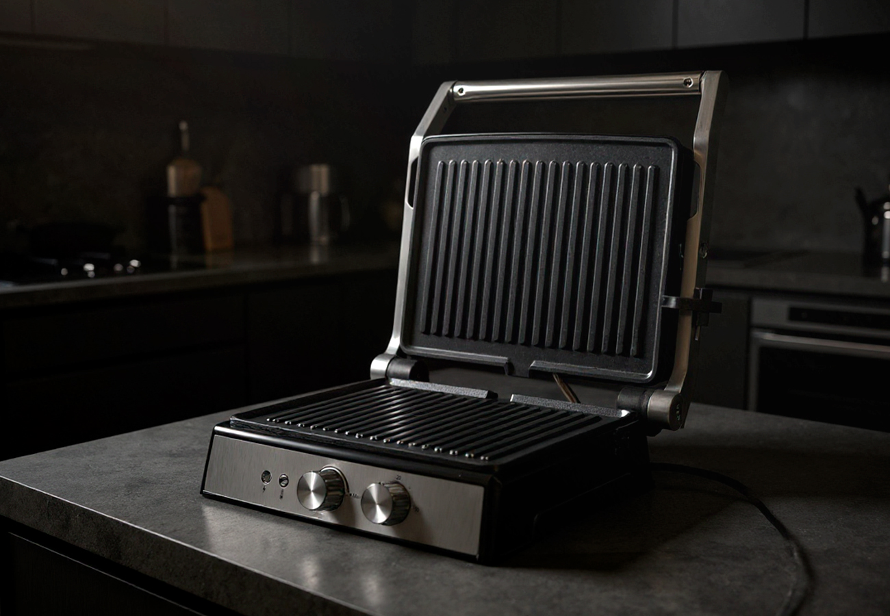 Рабочая поверхность гриля раскрывается на 180°, что позволяет готовить на двух панелях одновременно. Это удобно для приготовления овощей, мяса или морепродуктов для барбекю. Можно готовить бургеры: на одной панели обжарить котлеты, а на другой — булочки. Устройство может использоваться как пресс-гриль для обжаривания мяса, рыбы или овощей с двух сторон.