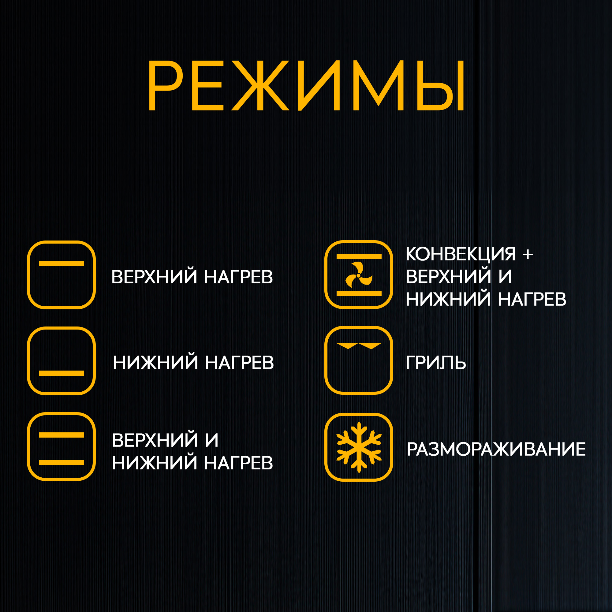 | Режимы | Размораживание, Верхний нагрев, Нижний нагрев, Верхний и нижний нагрев, Гриль, Конвекция + нижний и верхний нагрев |