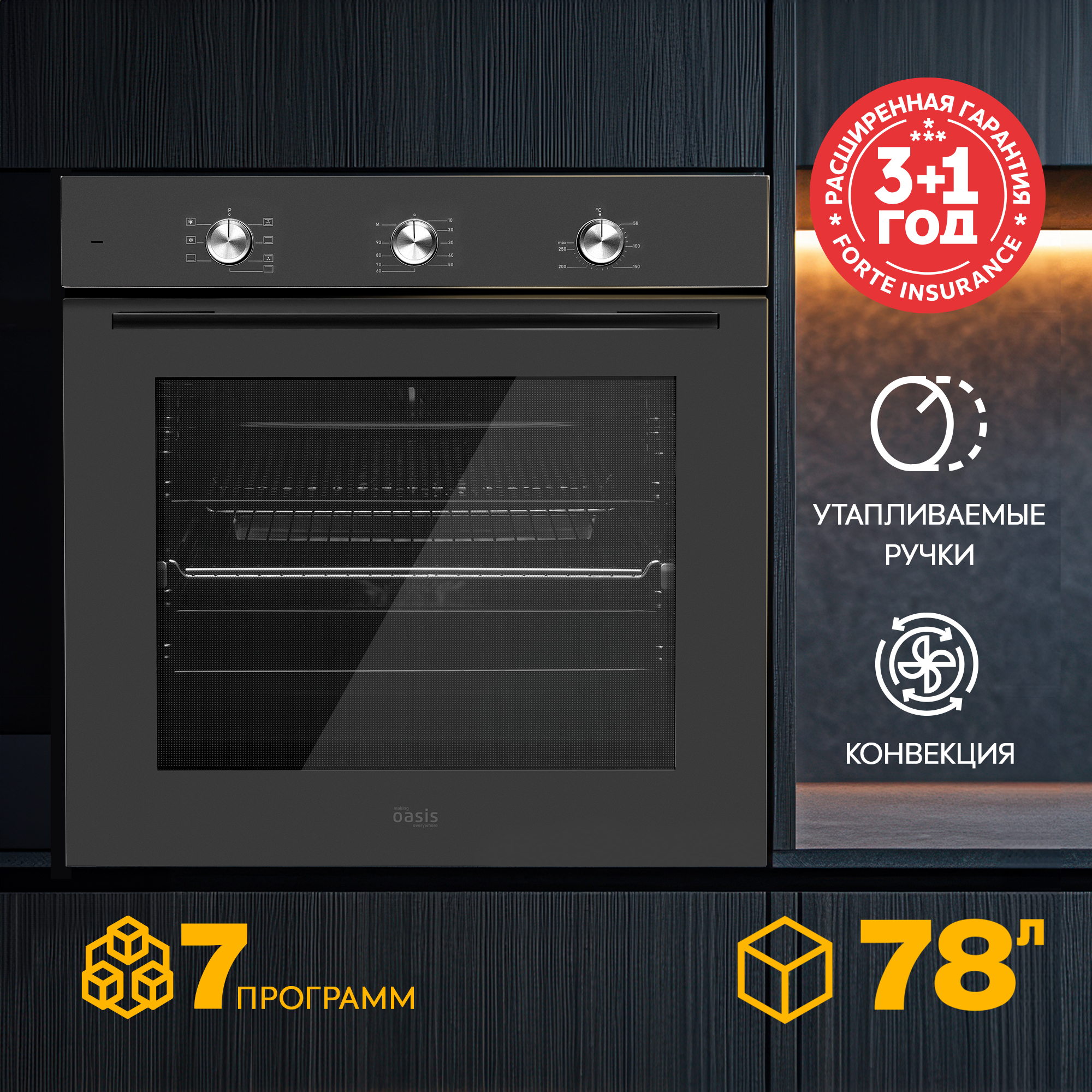 7 режимов работы открывают простор для кулинарных экспериментов. Механический таймер обеспечивает интуитивно понятное и надежное управление без сложных электронных настроек. С объёмом внутренней камеры 78 литров можно готовить несколько блюд одновременно для большого застолья. Конвекция обеспечивает равномерное приготовление благодаря циркуляции горячего воздуха по всей камере духовки. Эмалированная внутренняя камера легко очищается от жира.