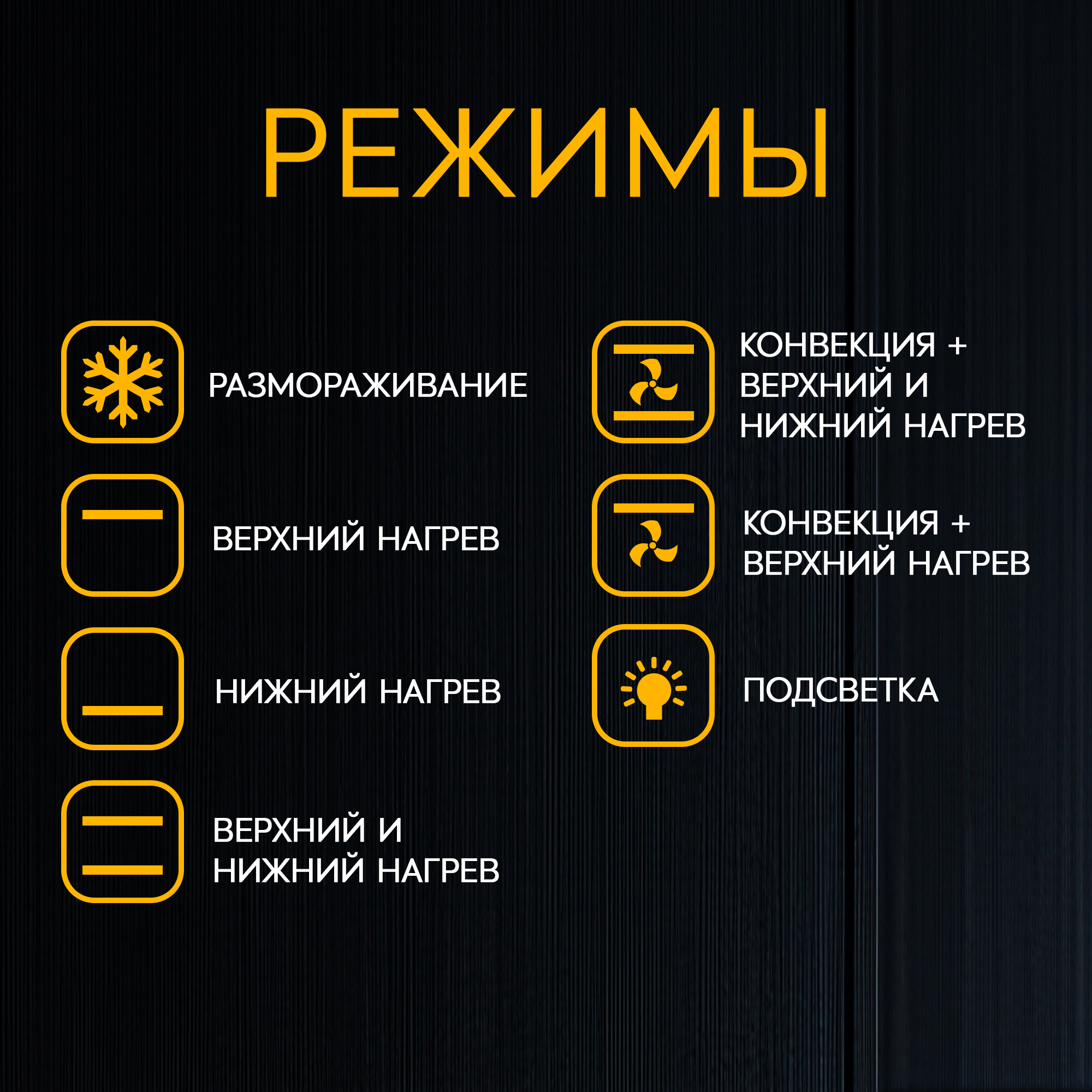 | Режимы | Размораживание, Верхний нагрев, Нижний нагрев, Верхний и нижний нагрев, Конвекция + нижний и верхний нагрев, Конвекция + верхний нагрев, Подсветка |