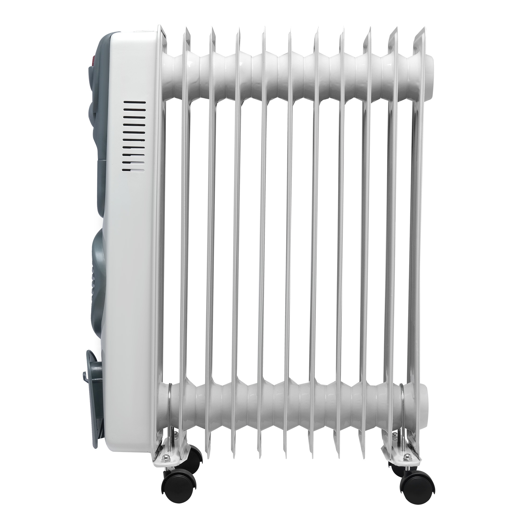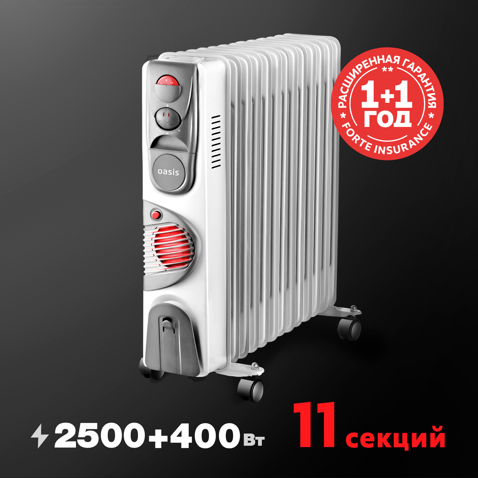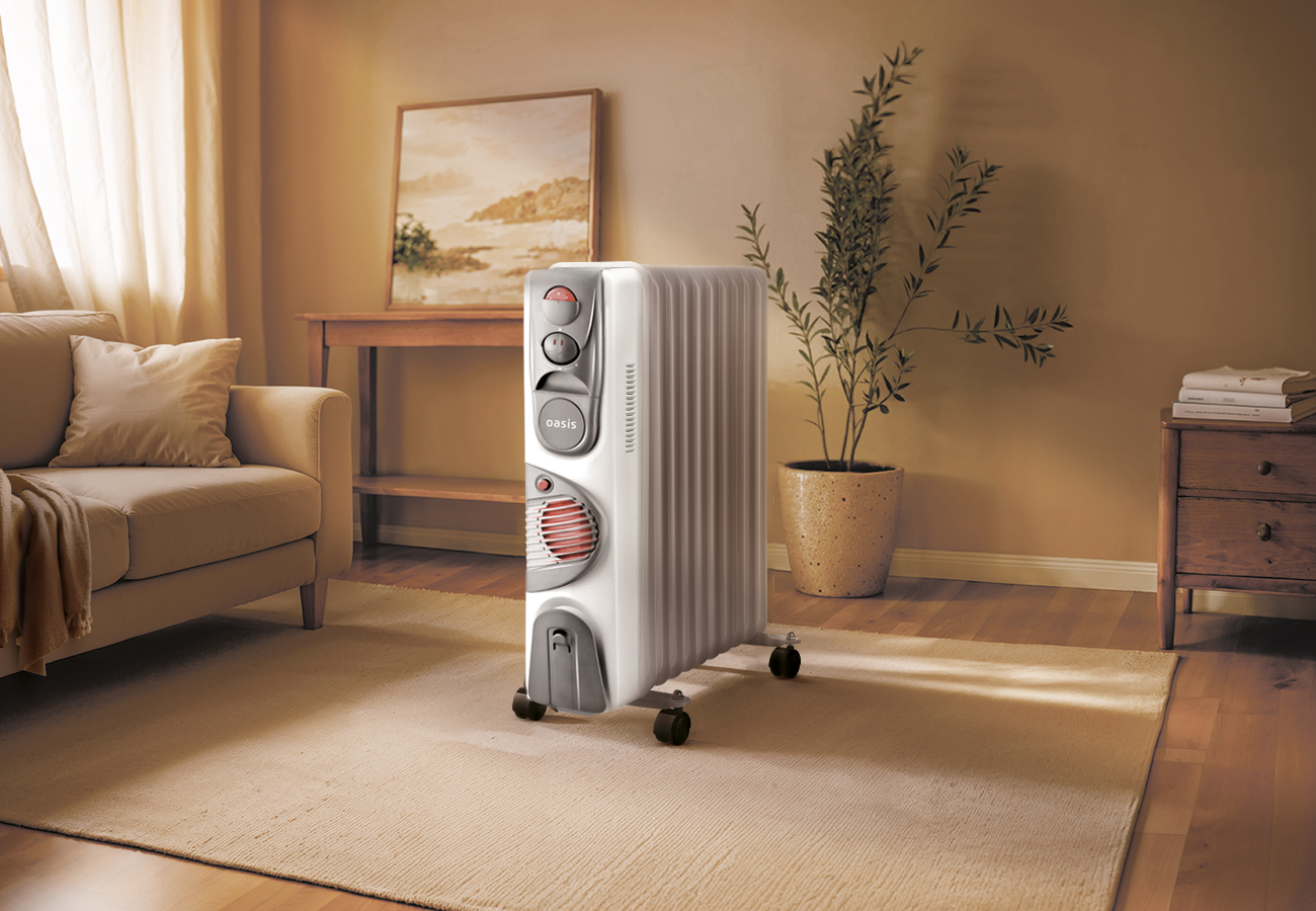 Масляный радиатор отопления с вентилятором Oasis - электрический отопительный прибор, предназначенный для обогрева помещений. Основу устройства составляет металлический корпус, заполненный минеральным маслом, и ТЭН, который нагревает масло. От классических моделей радиатор отличается наличием вентилятора, который при включении быстро распространяет тёплый воздух по комнате. После прогрева вентилятор можно отключить для бесшумного обогрева.