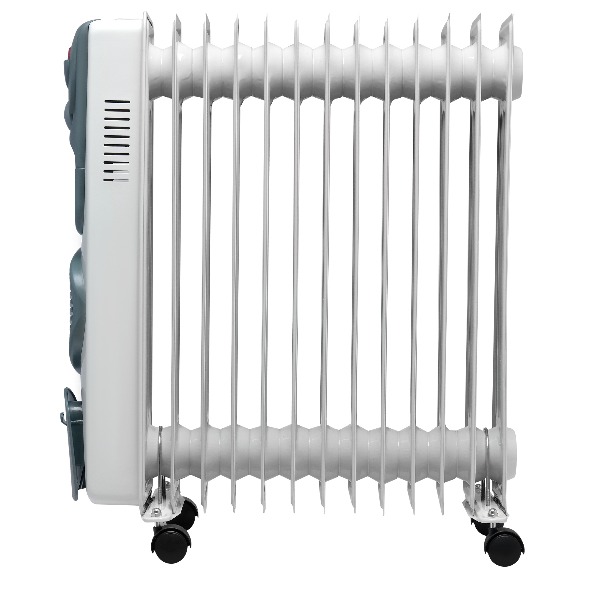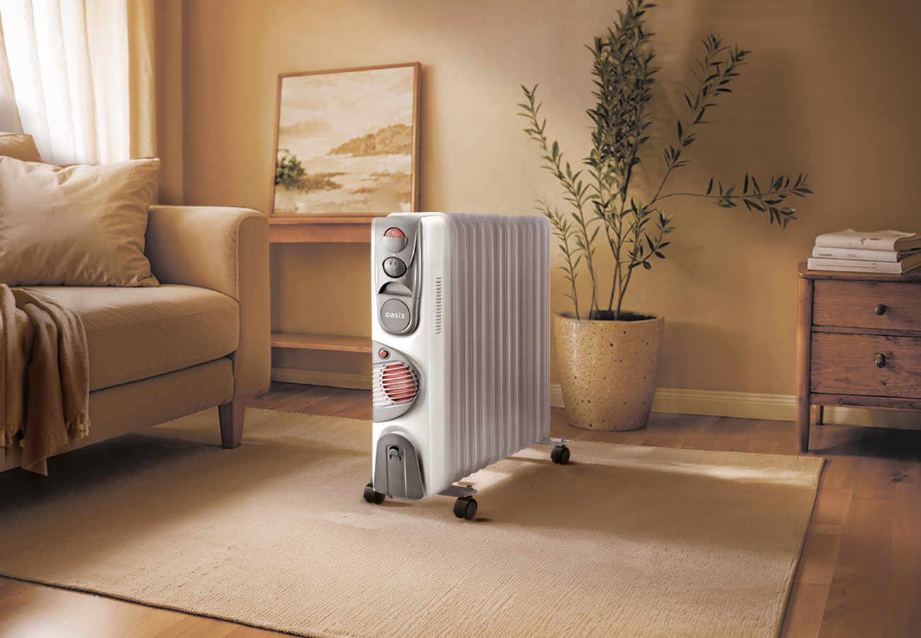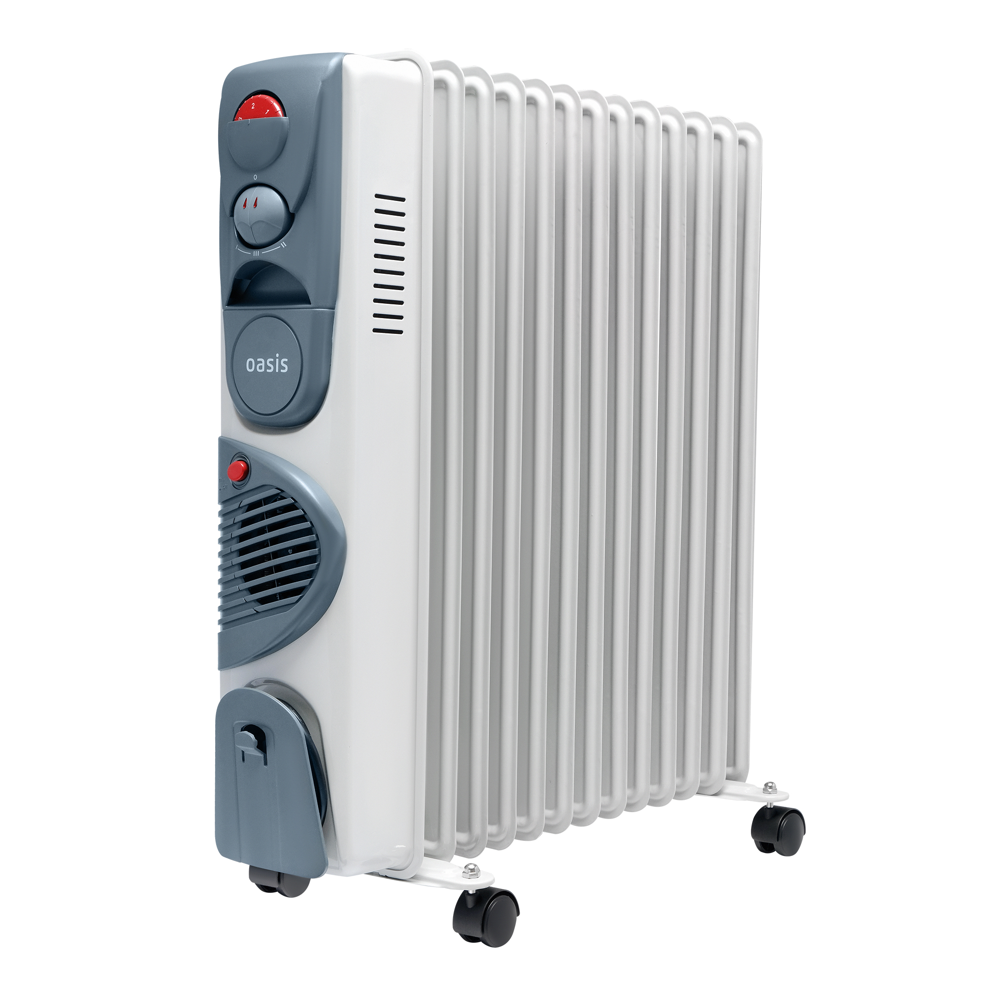 Масляный радиатор отопления с вентилятором Oasis - электрический отопительный прибор, предназначенный для обогрева помещений. Основу устройства составляет металлический корпус, заполненный минеральным маслом, и ТЭН, который нагревает масло. От классических моделей радиатор отличается наличием вентилятора, который при включении быстро распространяет тёплый воздух по комнате. После прогрева вентилятор можно отключить для бесшумного обогрева.