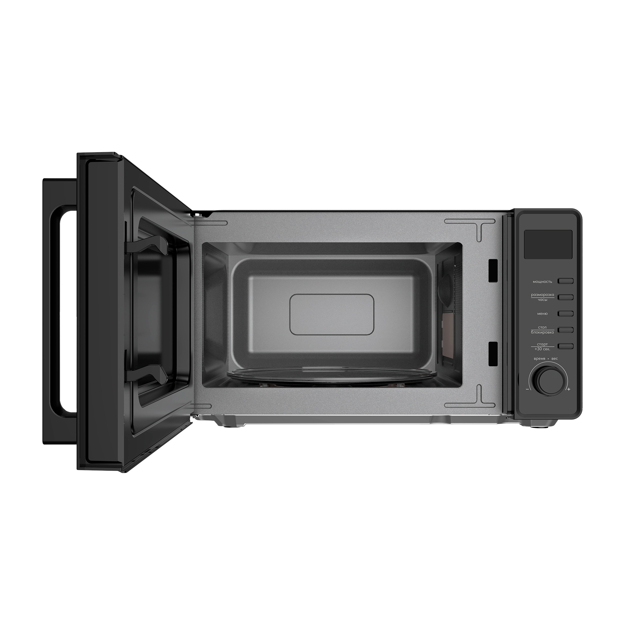 Механическое управление позволяет в одно движение выбрать время работы и включить устройство. Функция разморозки будет полезна, если нужно быстро довести продукт до пригодного для приготовления состояния. Строгие черты идеально впишутся в современный дизайн, будь то кухня или рабочий кабинет.