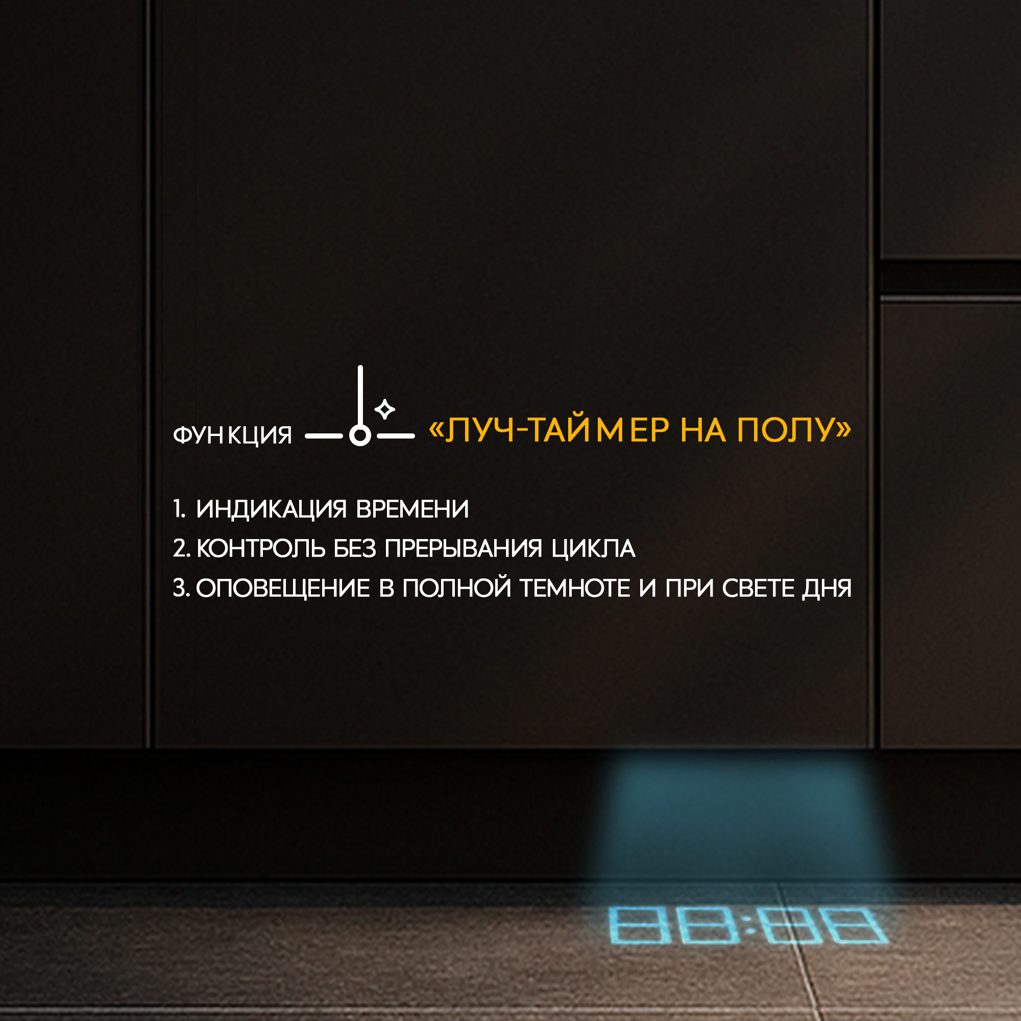 Дозагрузка посуды позволяет добавить забытый предмет в середине цикла, не останавливая её. Половинная загрузка позволяет не тратить много электроэнергии, воды и моющего средства при мытье небольшого количества посуды. Разбрызгиватель над верхней корзиной обеспечивает тщательное мытьё высоких и крупных предметов в верхней корзине за счёт дополнительного потока воды под давлением. Внутренняя подсветка облегчает контроль за состоянием посуды. Луч на полу c таймером позволяет визуально определить, идёт мойка или завершена, а также сколько осталось до завершения, на расстоянии, не подходя близко и не открывая дверцу. Автоматическое открытие двери обеспечивает естественное высыхание посуды за счет притока свежего воздуха после окончания цикла, экономя Ваше время. Яркий LED-дисплей отображает выбранные программы, оставшееся время и другую важную информацию. Полный AquaStop – улучшенная система защиты, которая исключает протечку воды как внутри прибора, так и снаружи, предотвращая любые затопления.